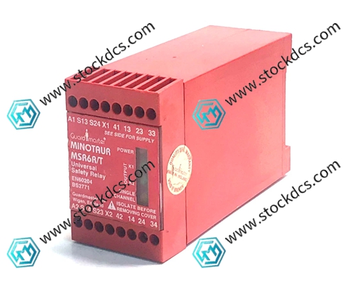 MSR6R/T (Allen Bradley Guardmaster Minotaur series, model 440R-C23017/18/19) is an industrial grade single function safety monitoring relay used for emergency stop, safety door interlock and other safety circuits, meeting EN ISO 13849-1 Cat.3 and Stop 0 safety levels.